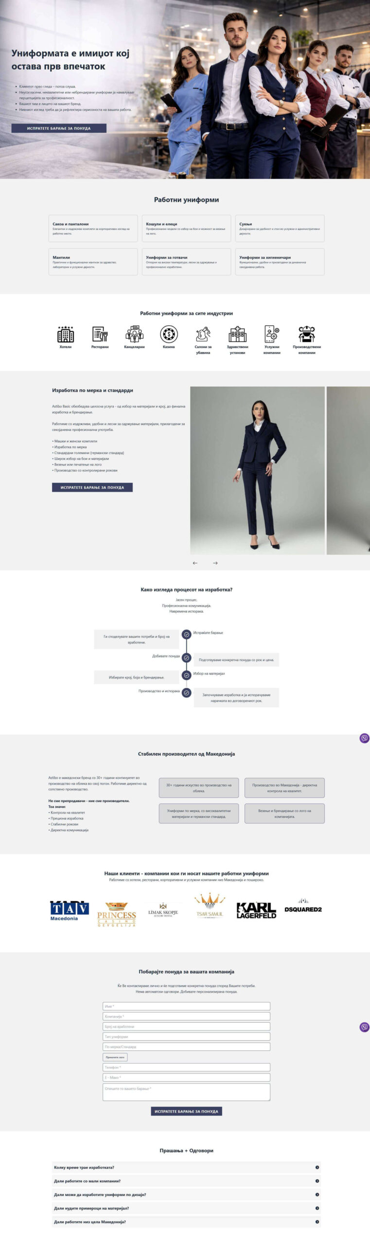 Лендинг страница за Astibo Basic – униформи, изработена како дел од таргетирана продажна кампања на социјални медиуми. Страната е креирана со јасна цел – генерирање на побарувања и директни нарачки преку прецизно структуриран продажен фунел.