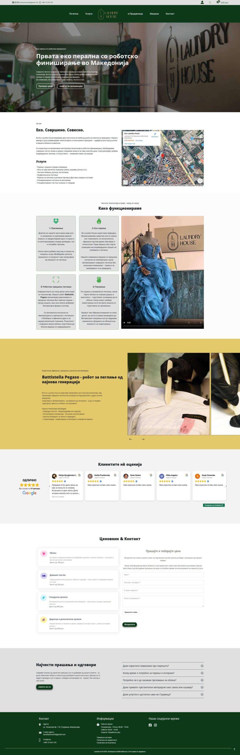 Laundry.mk претставува модерна и професионална онлајн платформа, создадена за лесна комуникација со клиентите и едноставно закажување на услуги, со јасна структура и визуелен идентитет кој асоцира на свежина, доверба и грижа.